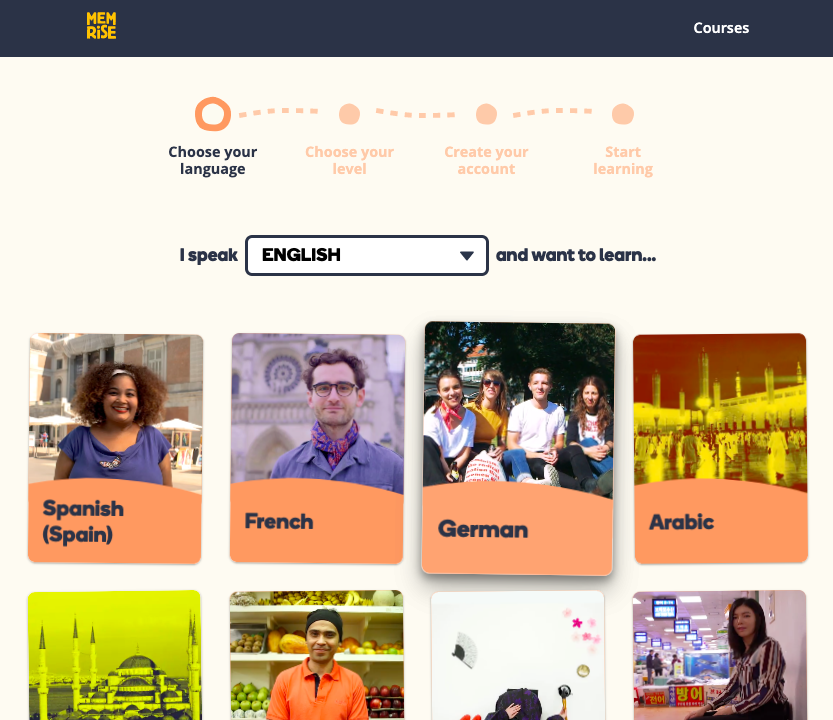 3. Selecione o idioma que você fala e um idioma que deseja estudar (note que você poderá explorar outros cursos e idiomas depois de se cadastrar!)