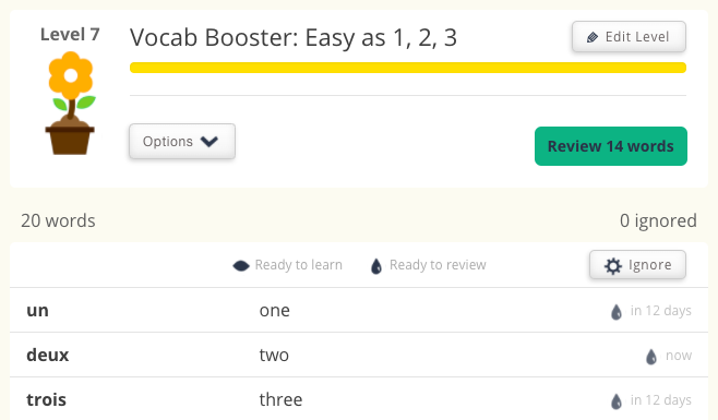 Bạn có thể xem khi nào các từ cụ thể sẽ được ôn tập bằng cách truy cập từng cấp độ riêng lẻ trên trang web.